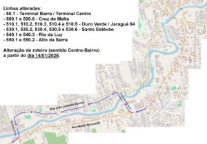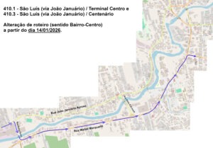 Em virtude da implantação do binário nas ruas João Januário Ayroso (Jaraguá Esquerdo) e Walter Marquardt (Barra do Rio Molha), a Prefeitura de Jaraguá do Sul por meio da Diretoria de Trânsito e Transporte da Secretaria de Planejamento e Urbanismo e a empresa Senhora dos Campos, informam que o transporte coletivo também passará por mudanças em algumas linhas. As alterações iniciam no dia 13/01/2026, com as linhas 410.1 (São Luís – via João Januário/Terminal Centro) e 410.3 (São Luís – via João Januário/Centenário), seguindo com as demais mudanças a partir do dia 14/01/2026.