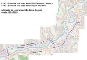 Novo roteiro Centro/Bairro: a partir da Rua Feliciano Bortolini, vai virar à esquerda na Rua Olga Feldmann Ulrich, seguindo pela Ponte do Brasão, seguindo pela rotatória de quadra do São Luís, até acessar a Rua Francisco Hruschka.