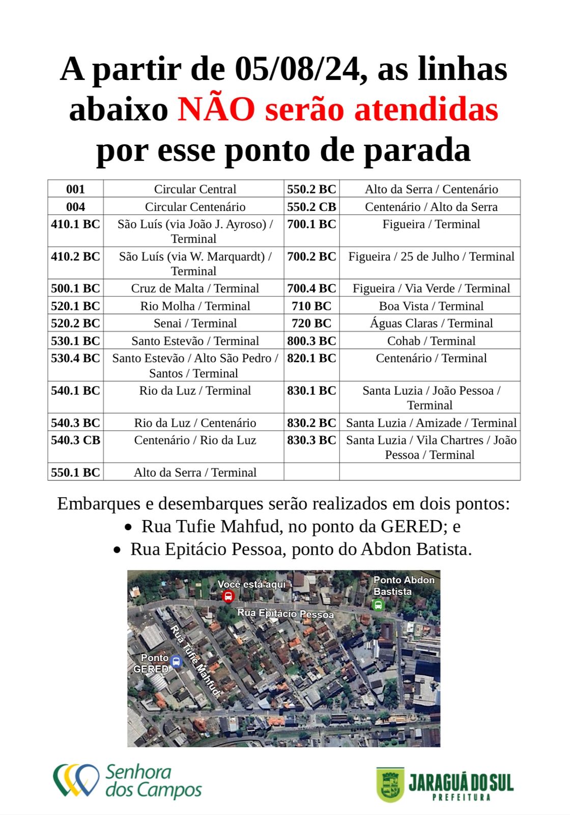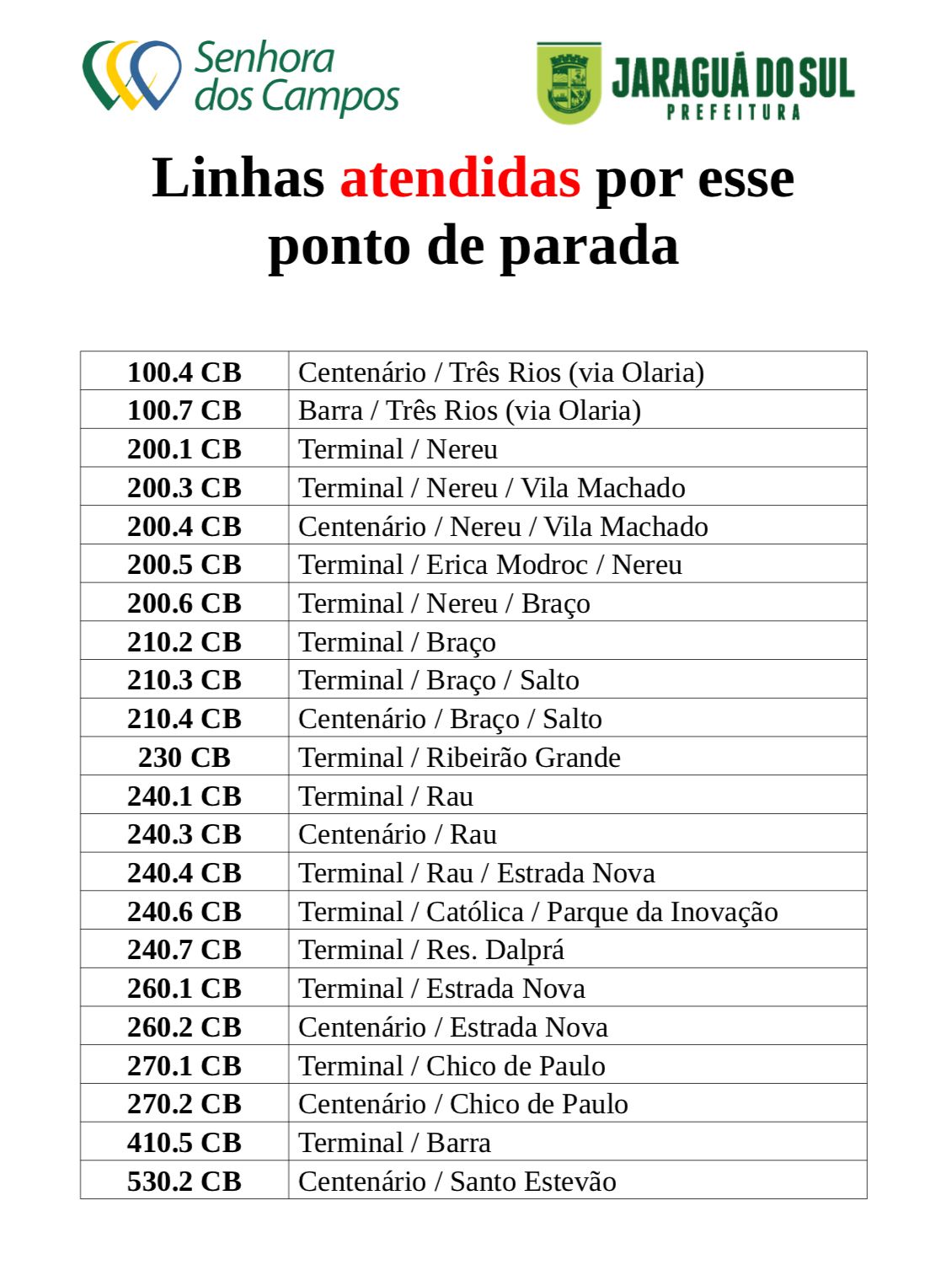 A Diretoria de Trânsito e Transportes da Secretaria de Planejamento e Urbanismo e a concessionária Senhora dos Campos informam sobre as linhas atendidas e não atendidas pelo ponto de ônibus localizado próximo ao Colégio Alfa Jangada: