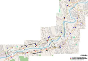 Novo roteiro Bairro/Centro: a partir da Rua Francisco Hruschka, seguirá pela Ponte do Brasão e acessará a Rua Ângelo Rubini.
